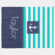 Nautical fleece blanket with turquoise & navy blue striped pattern and customizable text.