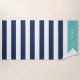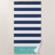Preppy chic personalized beach towel in aqua and navy features classic wide navy blue and white stripes, with your name or choice of personalization along the bottom in bold white lettering on a band of summery turquoise teal.