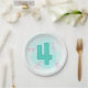 The number four is painted in aqua on a lighter aqua background. Four pink swirls are pictured around the four. They are printed on paper plates, for the fourth birthday.