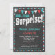 Un aqua de tableau noir funky et une invitation à l'anniversaire rouge surprenant avec le texte "Surprise !" en haut avec un arrière - plan de tableau noir, des drapeaux et une jolie bordure de pois-pois.