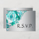 Ce mariage contemporain en argent et en aqua RSVP présente un joli bouquet de rose aqua (ou turquoise - avec une pointe de rose) dans le coin supérieur gauche. Dans l'arrière - plan il y a une base métallique argentée brillante. Au fond de la carte se trouve également un petit bouquet de rose aqua.