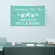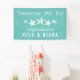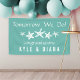 Welcome guests with our beachy personalized banner, perfect for rehearsal dinners or wedding welcome parties. Design features a solid aqua background with white starfish illustrations and three lines of custom text. Shown with "Tomorrow We Do!" and a congratulatory message with the couples' names.