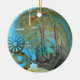 Fantasy digital graphic features a snail shaped Steampunk time travel machine with abstract aqua background