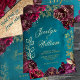 An aqua teal blue jewel tone wedding invitation featuring a symphony of deep raspberry purply red peonies adorned with gold foil spray and shimmering gold foil outlines on a mid aqua teal blue watercolor-wash background. Your first names are printed in a lively rustic gold foil script with a small uppercase non-serif font for your details.
