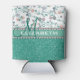 A aqua / turquoise / teal glitter that sparkles on the bottom, and a pattern with twirl / swirl flower design background pattern on the top with green / aqua vines and pink / purple flowers. The centre is left for personalization / personalize surrounded with white diamond rhinestones. (PHOTO PRINT)
