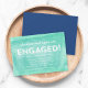 Modern Engagement Party invitation featuring the word "Engaged!" in white against an aqua turquoise shade rolled ink pattern background. Invitation has a blue back side.