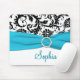 This elegant looking black and white damask mousepad has a PRINTED aqua blue ribbon and crystal brooch on it. Customize it with your own name, monogram, or other text.