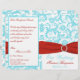 This 8.5"x11" aqua blue and white damask wedding program has a bright red PRINTED ribbon with a PRINTED crystal jewelled brooch on it. It matches the wedding invitation and other items shown below and is fully customizable. It is designed to be folded down the centre. ****PLEASE NOTE that the higher grade paper is a card stock and does not fold well. All the text is customizable. Existing matching items in this design are shown below. Email niteowlstudio@gmail.com if you need any assistance with the customization of this, or if you have any questions or requests.