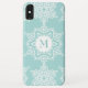 This Christmas phone case features a pretty snowflake pattern design with monogram on an aqua background. Personalize it with an initial.