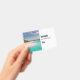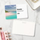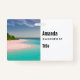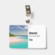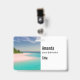 Name tag with a beautiful photograph. A scenic tropical beach with aquamarine water and a white sandy beach with a lush forest in the back.