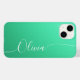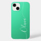 Aquamarine Shimmer White Elegant Calligraphy Script Custom Personalized Name iPhone 14 Smart Phone Cases features a modern and trendy simple and stylish design with your personalized name in elegant hand written calligraphy script typography on a metallic aquamarine shimmer background. Designed by ©Evco Studio www.zazzle.com/store/evcostudio