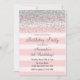 Invitation d'anniversaire avec parties scintillant faux argent et rayures roses arrière - plan d'aquarelle.