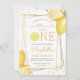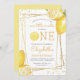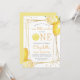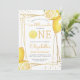 Cette invitation à la fête de premier anniversaire à la citronnelle sur le thème des agrumes présente un cadre géométrique doré orné de citrons d'aquarelle. Le mot "ONE" apparaît en majuscules jaunes avec une tranche de citron aquarelle à la place du "O". Ajoutez le nom et l'anniversaire de votre petite sucré dans le script d'écriture moderne jaune et les détails de la fête dans le gris charbon sans serif. Le dos de la carte est jaune solide. Un thème idéal pour une fête d'été !