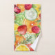 Aquarelle Été La serviette à la main décorée de fruits alléchants comprend des concombres, des cerises, des framboises, des citrons, des citrons, des limes, des oranges et des sprigs de romarin.