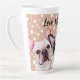 Tasse en latte de bulldog française avec trois frenchies d'aquarelle avec un arrière - plan arrière - plan à point orange. Un cadeau parfait pour un éleveur français de Bulldog ou quelqu'un qui possède et aime les frenchies. Le texte peut être modifié.
