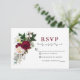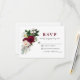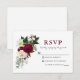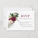 Carte RSVP de mariage élégante avec aquarelle de fleurs de Bourgogne Marsala et verdure comprenant des pivoines, des feuilles d'eucalyptus et d'autres verdures magnifiques. Dos blanc.