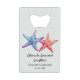 Plongez dans l'art de la mer avec notre Aquarelle Starfish Beach Wedding Favor Carte de crédit Bottle Opener - une fusion captivante de l'aquarelle élégance et de praticité. Cet exquis ouvre-bouteille présente une belle étoile de mer peinte à l'aquarelle, avec le côté arrière qui présente un magnifique tableau arrière - plan d'étoiles de mer. C'est le cadeau mariage idéal pour les clients, adapté aux thèmes plage, côte, destination, Hawaii, sous-marin ou mariage d'été. Conçu avec une précision artistique, cet ouvre-bouteille de carte de crédit est un gardien chéri, captant la fluidité et la grâce de la vie sous-marine. L'étoile de mer peinte à l'aquarelle apporte une touche d'élégance fantaisiste, en faisant un souvenir idéal pour vos proches. Conçu pour être à la fois distinctif et pratique, notre Aquarelle Starfish Beach Wedding Favor Carte de crédit Bottle Opener est plus qu'un outil; c'est un symbole d'amour et d'appréciation pour la beauté fascinante de la mer. Le design recto verso permet une expérience visuelle complète, ce qui le rend parfait pour les thèmes plage, côte, destination, Hawaï, sous-marin ou mariage d'été. Célébrez votre journée spéciale avec les teintes enchanteresses de l'océan. Commandez l'aquarelle Starfish Beach Wedding Favor Credit Card Bottle Opener maintenant et offrez à vos invités un souvenir qui capture l'essence artistique de votre plage ou de la célébration sur le thème côtier. Bravo pour l'élégance balnéaire et les souvenirs éternels! Veuillez cliquer sur le bouton Personnaliser pour le customiser avec votre texte. Veuillez visiter mon magasin "loveyouart" pour d'autres designs ou similaires.