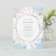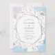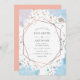 Faire-part de mariage avec des éclaboussures d'aquarelle violette et bleue et un cadre d'or rose géométrique et inversé.