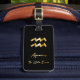 Elegant luggage tag with gold aquarius sign on black background.