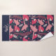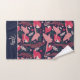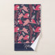 Ara Parrot Tropical Pattern Drawing Monogram Name Bath Towel Set. Ara pattern on dark blue background with tropical leaves in green, red and beige colours with a name in pink script. Great for parrot lovers and parrot owners. Add your name or monogram The towels are also available with the pattern only - open the collection below.