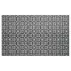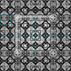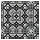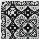 Fabric in an arabesque, geometric, mosaic tile pattern in black and white