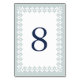 Modern Moroccan inspired table number cards feature a geometric border in ethereal pale blue-green and white, surrounding your table number in rich navy blue. Design repeats on reverse side. Coordinates with our Arabesque wedding invitation suite in Mist.