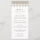 Our elegant wedding menu features your starter courses, entrees and desserts in rich champagne beige, accented with a Moroccan inspired geometric border along the top in pale linen beige and white. Coordinates with our Arabesque wedding invitation collection in Champagne.