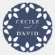 Seal your wedding invitation envelopes, favours and more with our elegant Moroccan inspired stickers in navy and white. Round design features your names connected by decorative script and surrounded by a geometric border in white on a classic navy blue background. Coordinates with our Arabesque wedding invitation collection in navy.
