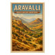Travel poster featuring the Aravalli Range, India, in a classic retro travel-poster style. Central focus on rolling ancient hills, rugged rocky outcrops, and desert-meets-forest landscapes with historic forts perched on ridgelines. Warm golden light bathes the terrain, creating a timeless, earthy atmosphere. Rich color palette of sandstone brown, desert gold, muted green, and soft sky blue. Clean graphic illustration with subtle vintage grain texture. Bold vintage typography headline: “ARAVALLI – INDIA’S ANCIENT MOUNTAINS”. Vertical 2:3 layout, high-resolution, print-ready.