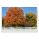 Arbre d'automne orange avec clôture blanche et bord de papier déchiré.