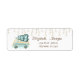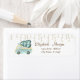 Camion vert avec des cadeaux, des pins et des lampes à cordes sur l'arrière - plan blanc. Un design élégant et sophistiqué. Customisez avec vos nom et adresse.