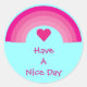Les autocollants bleu pâle avec un joli dessin animé rose arc-en-ciel et illustration cardiaque et les mots "Ayez une belle journée" couleur Arrière - plan & texte peuvent être changés en cliquant sur le bouton "Customiser" - des charges de polices & couleurs à choisir.