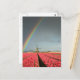 Carte postale verticale d'un arc-en-ciel coloré dans un ciel foncé au-dessus d'un moulin à vent et d'un champ rempli de tulipes rouge vif lors d'une tempête de printemps dans un paysage près d'Amsterdam dans la Pays-Bas.