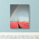 Impression paysage de toile verticale d'un arc-en-ciel coloré dans un ciel foncé au-dessus d'un moulin à vent et d'un champ plein de tulipes rouge vif lors d'une tempête de printemps dans un paysage près d'Amsterdam dans la Pays-Bas.