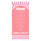 This wedding menu card has a retro groovy style inspired from the 70's with pink as the main colour. The front of the card shows a bohemian arch that frames the word menu and the rest text. Behind the arch, there is a background of pink and white sunrays that create a contrast. The back of the card has a diagonal design that repeats the names of the couple in a retro font. This card is perfect for a fun and funky wedding celebration.