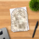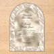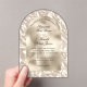 An arched acrylic wedding invitation featuring an elegant ivory foil background.