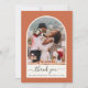 Minimal and elegant wedding thank you card for newlyweds featuring your photo in an arched picture frame against a terracotta background, "thank you" in a stylish modern script and your Mr & Mrs name and wedding date in simple typography. On the reverse side, you can personalize a thank you message and add your first names as a signature in the same script as on the front.