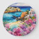 "Arches By The Sea". A idyllic view of a beautiful bay, with a single boat. A small sandy beach is framed by a beautiful azure sea and pink and purple flowers.