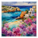 "Arches By The Sea". A idyllic view of a beautiful bay, with a single boat. A small sandy beach is framed by a beautiful azure sea and pink and purple flowers.
