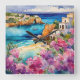 "Arches By The Sea". A idyllic view of a beautiful bay, with a single boat. A small sandy beach is framed by a beautiful azure sea and pink and purple flowers.