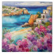 "Arches By The Sea". A idyllic view of a beautiful bay, with a single boat. A small sandy beach is framed by a beautiful azure sea and pink and purple flowers.