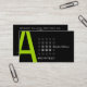 A modern business card for an Architect with a sleek black background and an original graphic design showcasing a large letter A and a square geometric grid. Customize the Initial to suit any profession and add company information.