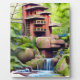 Beautiful tabletop art plaque features an AI generated  digital watercolor of a F.L. Wright prairie style architectural treehouse.