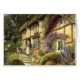 Image architecturale à illustration vintage représentant une maison de campagne anglaise classique avec un toit de chaume et de jolis jardins anglais et une femme debout au pied des marches. Ca pourrait être une belle auberge de campagne.