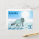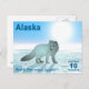 White on white. A 10-Nugget postage stamp issued by a mythical independent nation of Alaska. Features a digital painting of an Arctic Fox, Vulpes lagopus, on the polar ice. The sun hangs low in the bright blue arctic sky. Do not stare at the sun as it can harm your eyes. Text reading, "Alaska," "POSTAGE 10 NUGGETS," "Arctic Fox," and "Vulpes lagopus" also appear. The Arctic Fox is comfortable in deep cold; it does not begin to shiver until temperatures drop to about −70 °C (−94 °F) due to its dense, multi-layered fur. Other adaptations to a frigid climate include fur on the soles of its feet, short ears, and a short muzzle. Arctic foxes live in burrows, in a blizzard they may tunnel into the snow to create shelter. The coat of the Arctic fox, sometimes blue-grey, is very effective winter camouflage. The natural hues allow the animal to blend into the environment. During the short warm season its coat changes to brown or grey, again acting as camouflage in tundra rocks and plants. During the winter, when prey is scarce, the foxes follow hunting Polar Bears on the ice pack feeding on scraps. During the summer the eat rodents, birds, eggs, and even fish. They will also feed on berries and seaweed. Arctic Foxes have extremely keen hearing, aided by their wide, front-facing ears, which allow them to locate the precise position of their prey beneath the snow. If it hears something moving under the snow it leaps into the air and pounces, punching through the snow to catch its prey. The range of the Arctic Foxes is circumpolar; they can be found throughout the far north. The only land mammal native to Iceland, it arrived by walking oversea ice at the end of the last ice age.