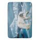 A white polar bear in the snow of the arctic of winter with an iceberg in behind