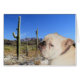 A photographic image of a white English bulldog is shown in the midst of impressive saguaro cacti in the Sonoran Desert.