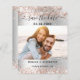 Un mariage moderne Save the Date carte photo. Un arrière - plan à l'aspect faux argenté décoré de confettis d'or rose. Personnalisez et ajoutez votre photo, les détails du mariage et votre propre code qr sur votre site mariage. Cette carte est disponible dans notre magasin sans le code QR au dos.