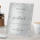 Faux arrière - plan d'apparence argentée, décoré de faux confettis d'argent. Avec le texte : S'il vous plaît signer notre livre d'or. Un panneau sur le plateau demandant aux clients de signer et de déposer leur livre d'or.