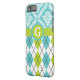 Argyle and damask pattern green, aqua monogram iPhone 6 cases. This cute, girly design features an argyle pattern in lime green, turquoise, white with black intercrossing lines and aqua white damask on the upper part. There is a green band across it and a circle with your monogram. This elegant, classy and stylish design is completely customizable. You can change background colour - turquoise and text colour choosing from over 200 colours from Zazzle colour chart. Contemporary and modern with a retro flair.